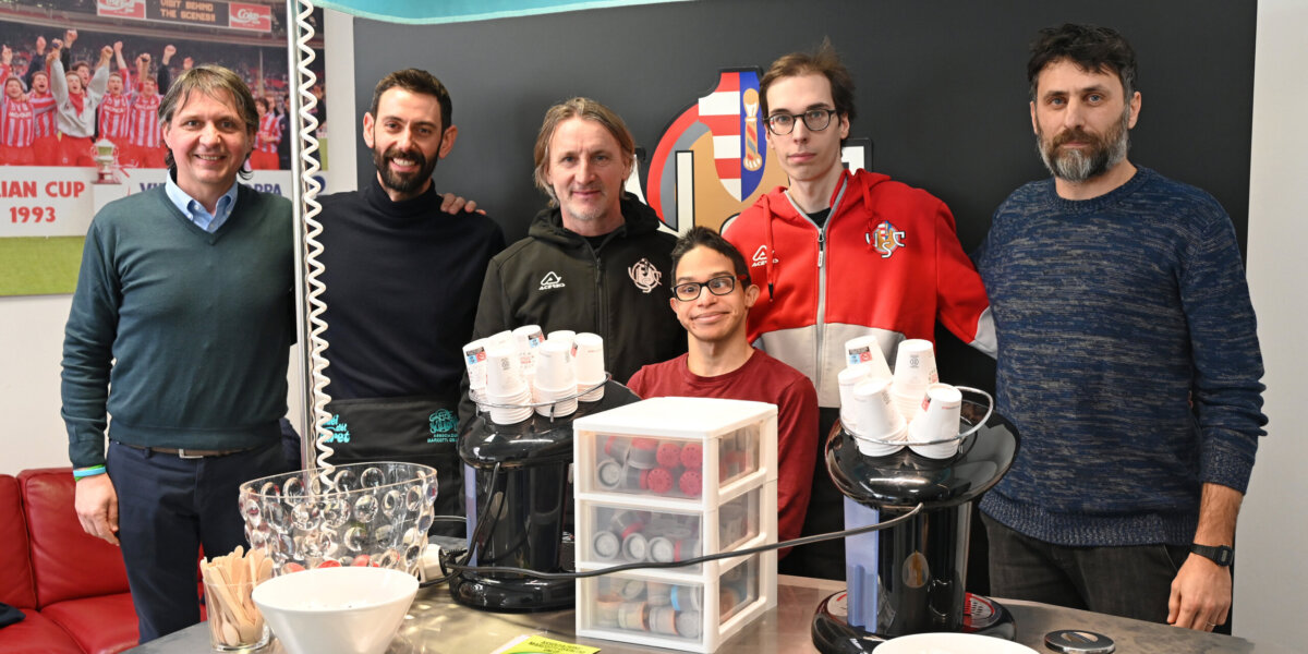 Nella clubhouse del quartier generale grigiorosso, si è tenuta una “pausa caffè” speciale, organizzata dall’Associazione Marcotti Osvaldo e Theverso, che favorisce l’inserimento lavorativo e il coinvolgimento di giovani con fragilità o disabilità