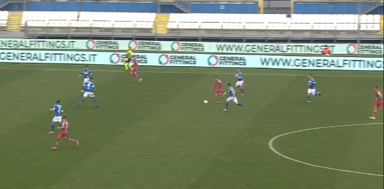 Questa scelta delle Rondinelle si può spiegare anche con la volontà di tenere 7 giocatori di movimento in un unico blocco difensivo (con l’eccezione, come detto, della mezzala autorizzata ad uscire sul terzino avversario) con l’intenzione di non farsi sorprendere (come accaduto in avvio con Gaetano) con i cambi campo verso il lato debole (quello cioè lontano da dove si trova la palla, nda).