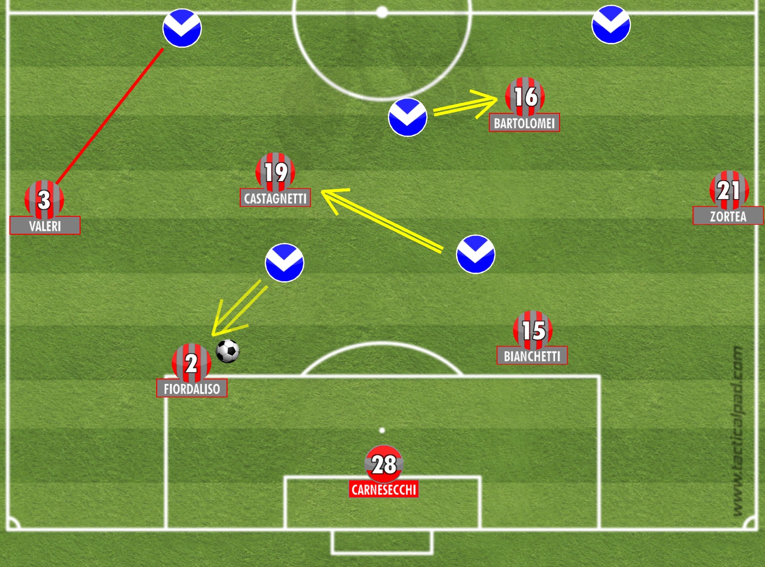 In fase di costruzione si è quindi rivisto il 2-4-3-1 già presentato contro il Pescara (qui l’articolo completo) e poi un po’ “ibridiato” nelle uscite successive con uno Zortea più conservativo e maggiormente vicino ai due centrali. Lo sviluppo di risalita della palla, però, è stato differente rispetto alla prima partita con Pecchia in panchina.