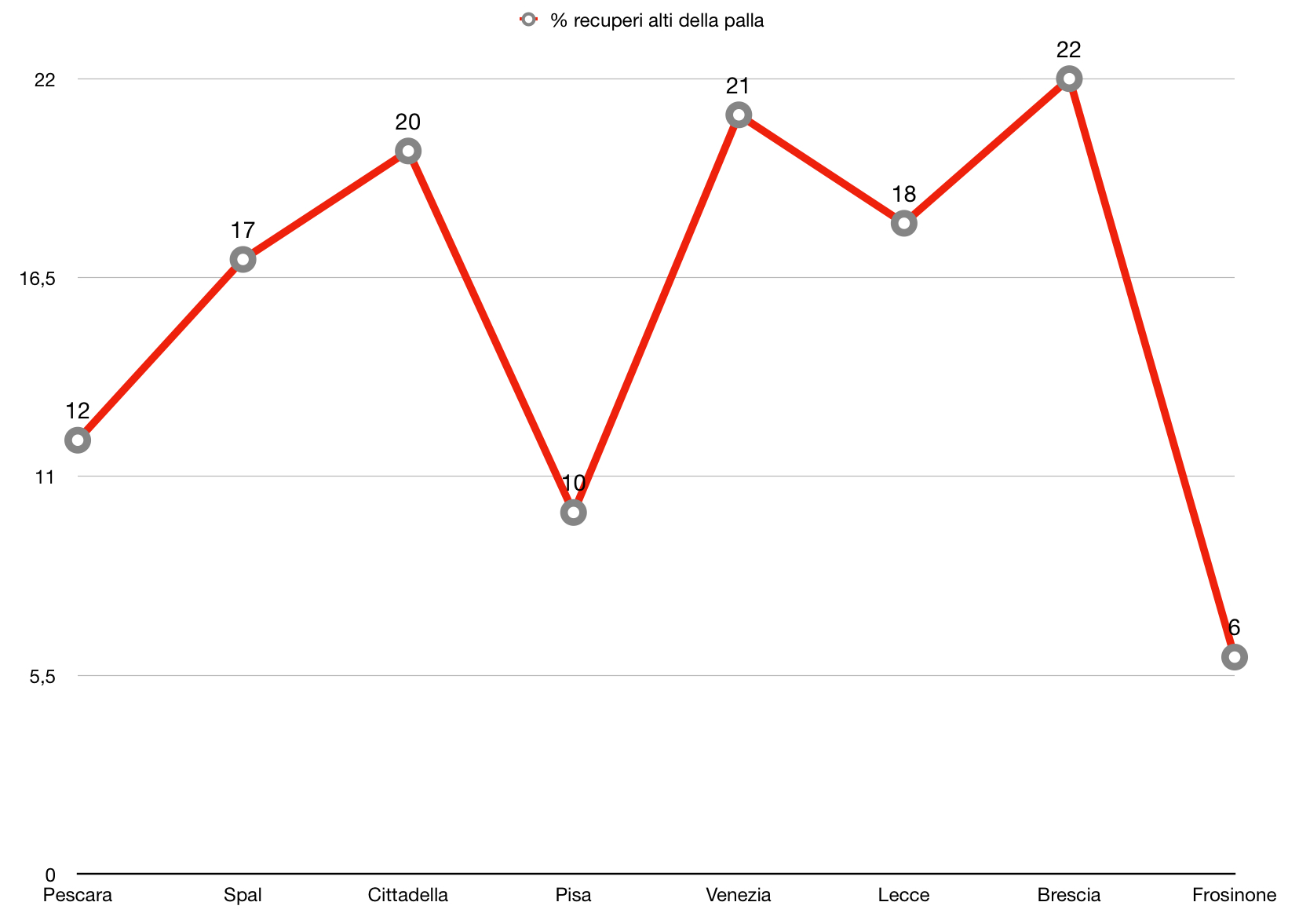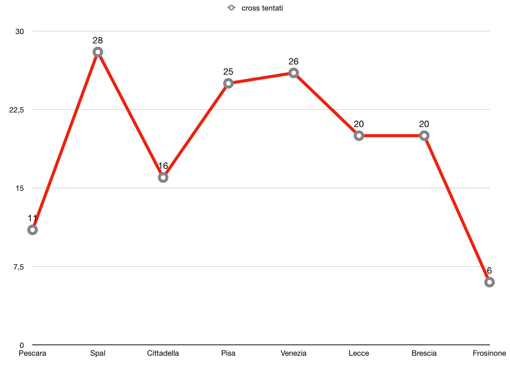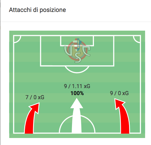 Costruendo sull’esterno, i girigiorossi hanno “stirato” la difesa del Frosinone per poi colpirlo per vie centrali, come testimoniato anche dal basso numero di cross tentati (solo 6, dato più basso da quando siede in panchina l’allenatore di Formia) e dall’efficacia degli attacchi portati per vie centrali, nonostante, in termini di volume, siano stati distribuiti in modo abbastanza uniforme.