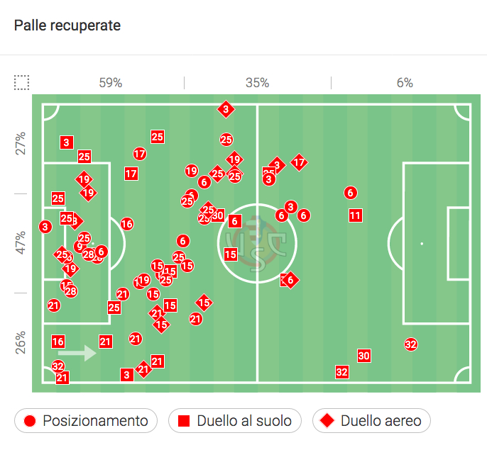 Inoltre, nonostante il 2-0 sia arrivato da una recupero in una zona abbastanza alta di campo, il numero complessivo dei palloni recuperati nell’ultimo terzo di campo (5) è il più basso dell’era Pecchia e corrisponde solo al 6% di tutti quelli recuperati.