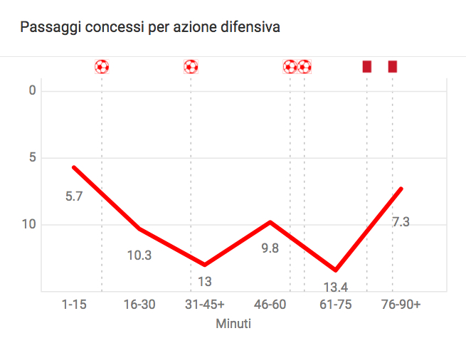 **PPDA: passaggi concessi per azione difensiva che includono le azioni all’interno degli ultimi 60 metri di campo della squadra che attacca. Più è basso, più l’intensità del pressing è elevata.