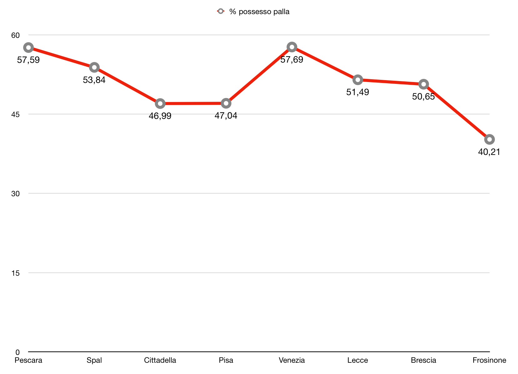 La percentuale di possesso palla è stata la terza più bassa della stagione (40,21%). La Cremonese ha deciso di ovviare alla maggior intensità nel pressing da parte del Frosinone (8,36 di indice PPDA**) aggirando per vie esterne ed affidandosi poi a passaggi piuttosto diretti per attaccare il Frosinone.