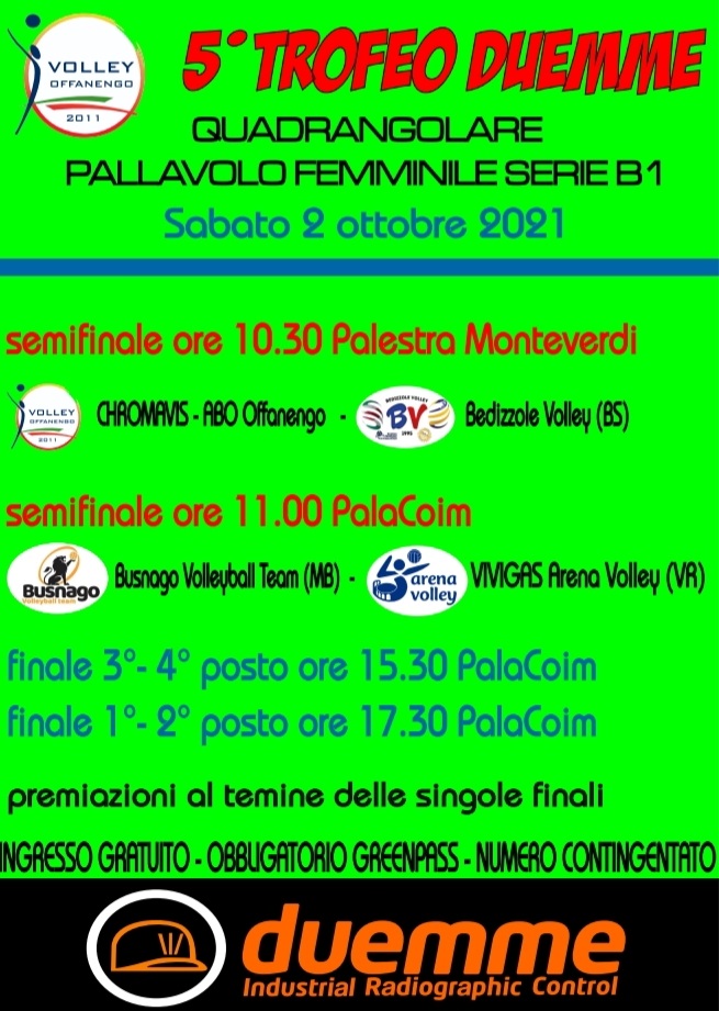 Nuovo week end all’orizzonte e nuovo torneo per la Chromavis Abo, che torna in campo in un altro appuntamento casalingo pre-campionato. Sabato 2 ottobre, infatti, sarà il giorno della quinta edizione del Trofeo Duemme, quadrangolare di pallavolo femminile di serie B1 organizzato dal Volley Offanengo e intitolato all’azienda di Madignano sponsor del sodalizio pallavolistico offanenghese presieduto da Pasquale Zaniboni.