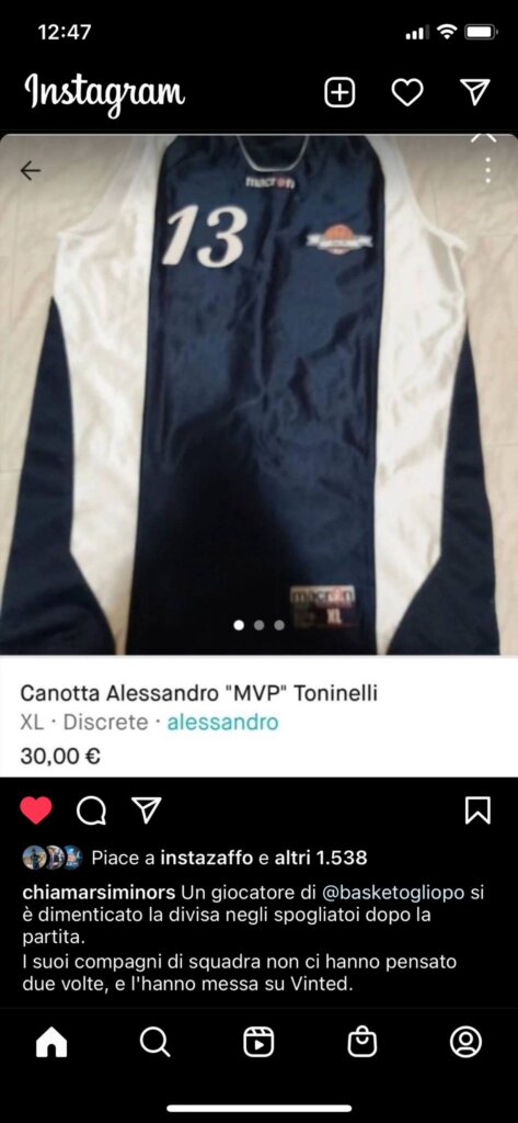 Alessandro Toninelli, infatti, aveva dimenticato la divisa da gioco dopo la partita negli spogliatoi. Come recita la pagina “Chiamarsi Minors”, “i suoi compagni di squadra non ci hanno pensato due volte e l’hanno messa in vendita su Vinted”. Il prezzo? 30 euro, ma è pur sempre la maglietta di un MVP, ossia del miglior giocatore di quella partita…