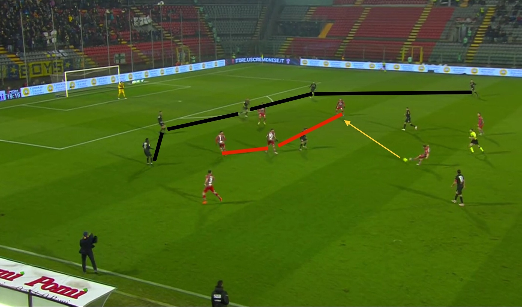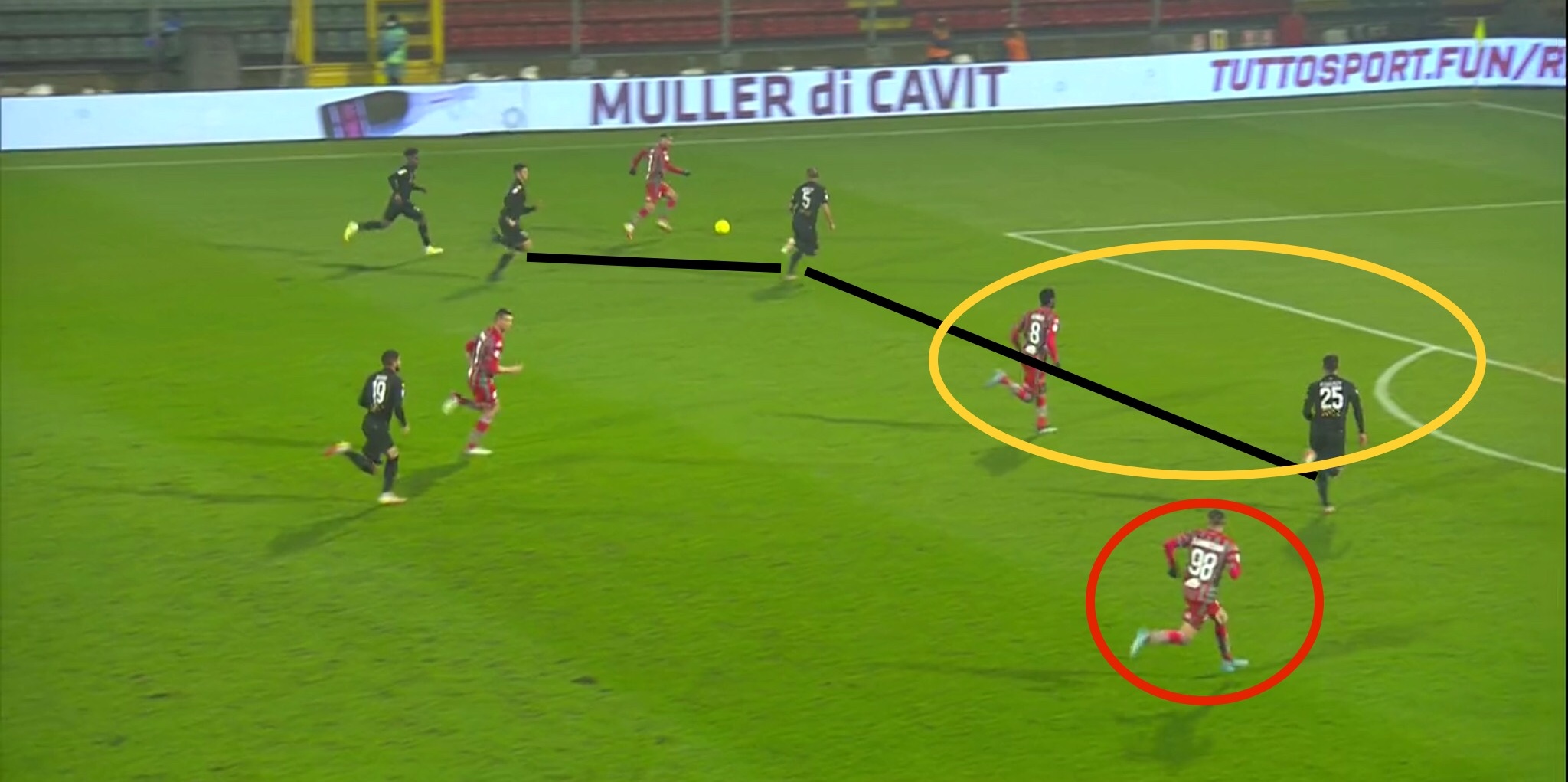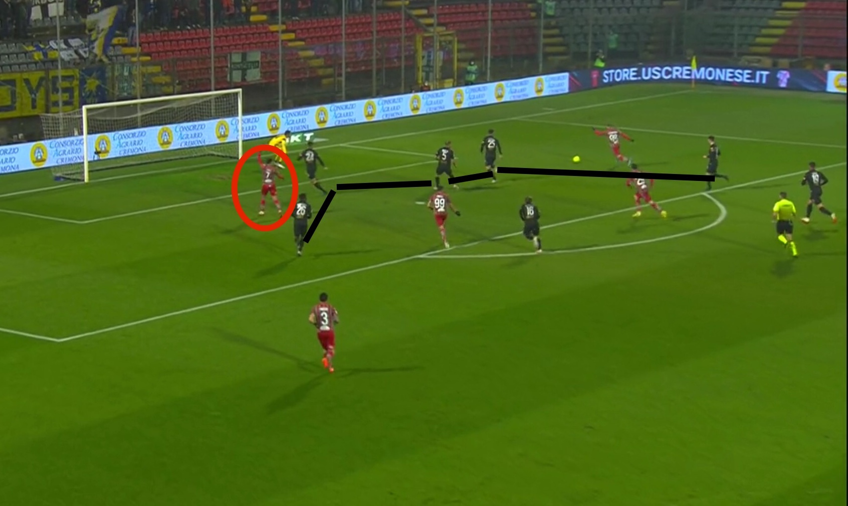 La rete del 3-0, pur avvenuto in un contesto di ripartenza e non di attacco posizionale come quella del vantaggio di Baez, ricalca principi simili. L’uruguayano conduce palla sulla sinistra con gli attaccanti della Cremonese che possono attaccare in superiorità numerica la retroguardia avversaria dopo che Osorio è stato saltato. Danilo prova a chiudere su Baez e Coppaut è costretto a stringere su Gondo per non lasciarlo solo al centro del campo, liberando però lo spazio per Zanimacchia, complice il ritardo di Man nello scalare sulla linea dei difensori.