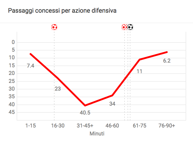 **PPDA: passaggi concessi per azione difensiva che includono le azioni all’interno degli ultimi 60 metri di campo della squadra che attacca. Più è basso, più l’intensità del pressing è elevata.