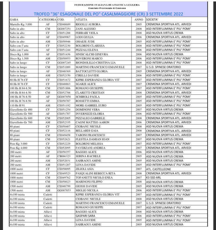 Il Fiduciario Tecnico Provinciale di Cremona Stefano Cosulich ha diramato le convocazioni per il 36° Esagonale del Po che si terrà a Casalmaggiore sabato 3 settembre presso il Campo Scuola di Atletica leggera – Centro Sportivo Comunale Baslenga di Casalmaggiore. 48 convocati che si sfideranno con gli atleti delle altre province: 20 dell’Atletica Interflumina, 13 della Virtus Crema, 11 della Cremona Sportiva Atletica Arvedi, 2 dell’Oratorio Spinese, 1 dell’Atletica Castelleone e 1 K3 SSD ARL. Saranno presenti anche ATLETI DIR (Disabilità Intellettiva Relazionale) del CSI di Crema, del CSI di Mantova e dell’Interflumina, che correranno i m. 80.