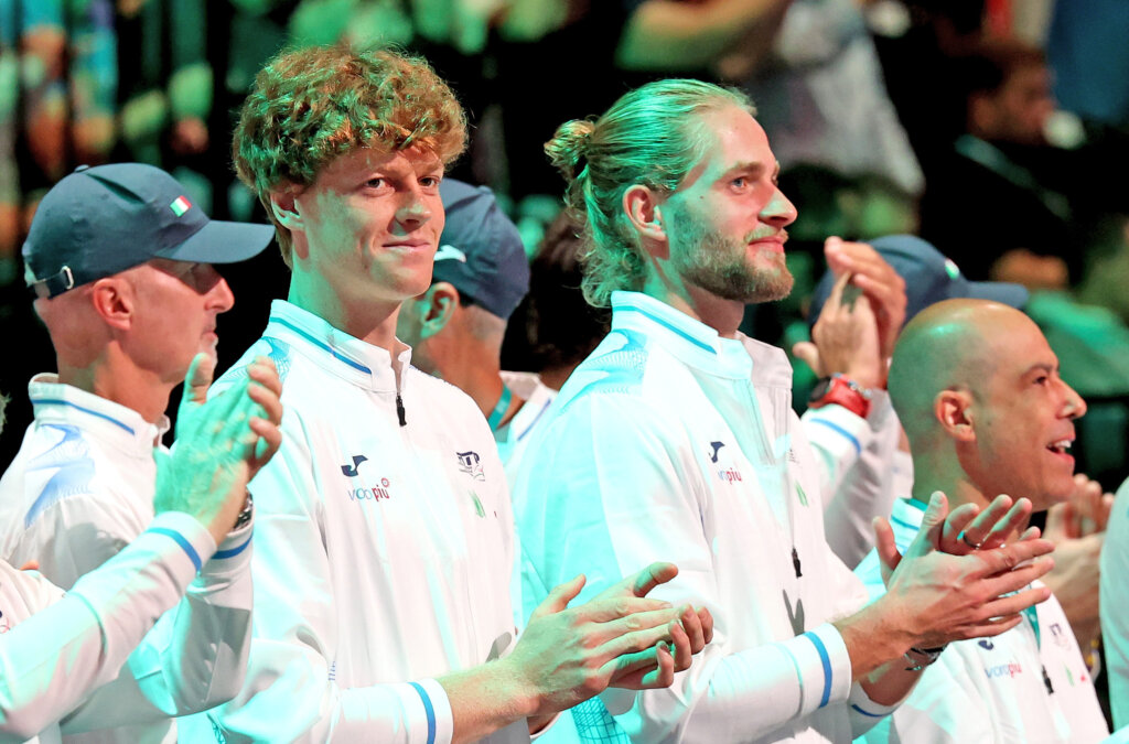 Davis Cup Finals Group Stage 2024 Bologna 15/09/2024 Italia-Olanda Jannik Sinner in piedi con tutto lo staff del team Italia durante l'inno nazionale Foto Giampiero Sposito