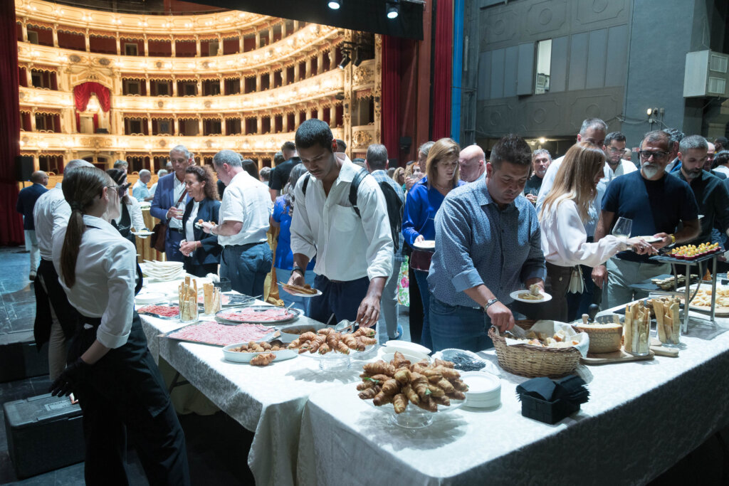 La platea, temporaneamente priva delle storiche sedute in fase di sostituzione, è stata trasformata in un inedito playground. Lì, al centro, si è tenuto l’Opening Party dedicato a partner, sponsor e amici della Vanoli. A fare gli onori di casa, la squadra al completo, lo staff tecnico e dirigenziale, con momenti di musica dal vivo, DJ set a cura di Radio Bruno Lombardia e una cena servita direttamente sul palcoscenico.