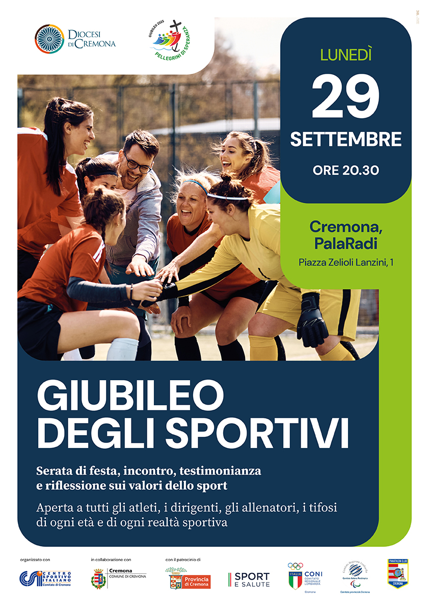 Una serata di festa, incontro, testimonianza e proposta sui valori dello sport con tanti ospiti importanti che verranno svelati nei prossimi giorni. Lunedì 29 settembre alle 20.30 il PalaRadi sarà teatro del “Giubileo degli sportivi” organizzato dalla Diocesi di Cremona e dal CSI oltre che la collaborazione di Comune e Provincia di Cremona. Per la partecipazione servirà compilare il form entro mercoledì 24 settembre. L’evento è aperto a tutti gli atleti, dirigenti, tifosi e allenatori senza distinzione d’età e di ogni realtà sportiva