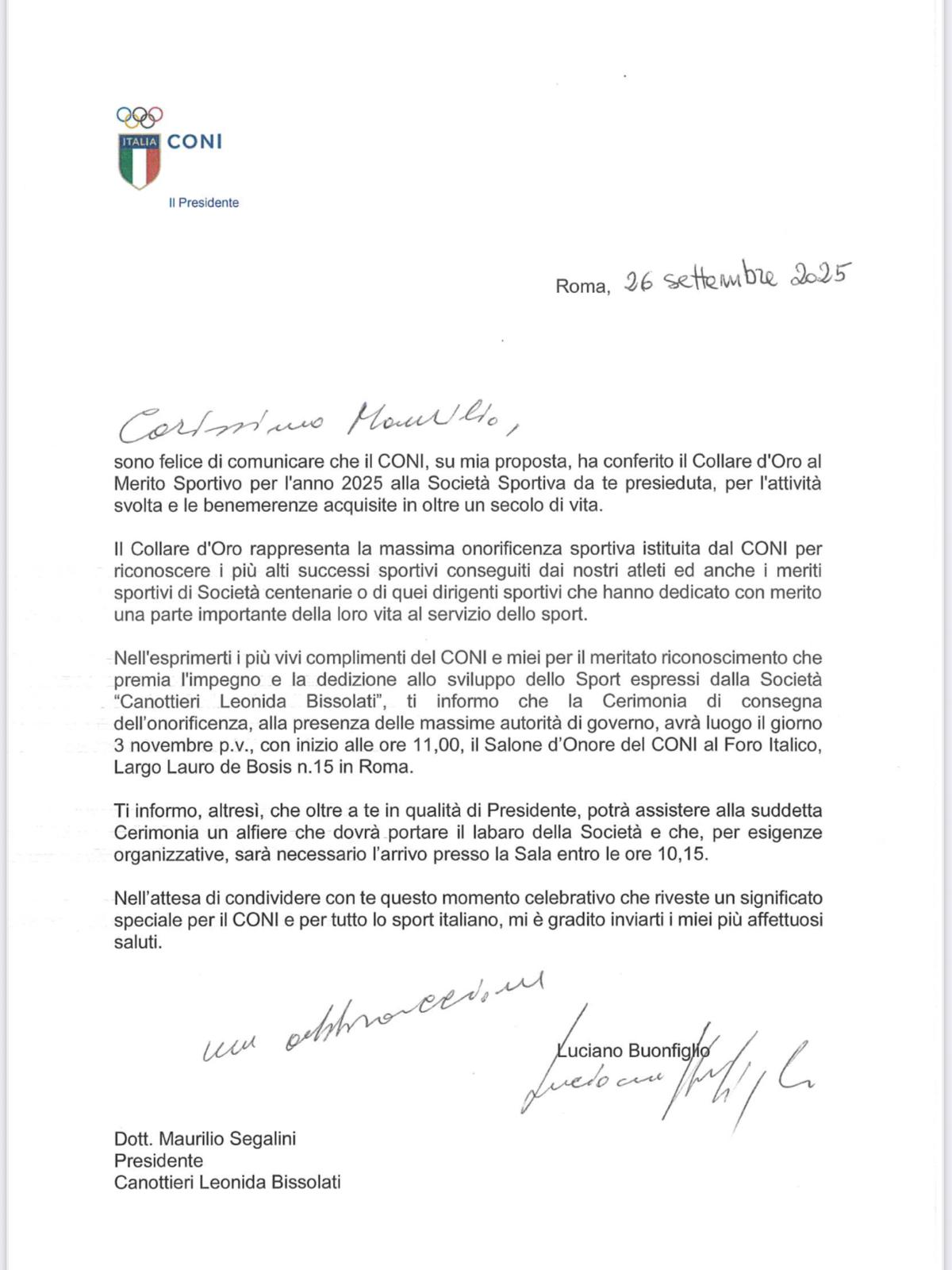 “Sono felice di comunicare che il CONI, su mia proposta, ha conferito il Collare d’Oro al Merito Sportivo per l’anno 2025 alla Società Sportiva da te presieduta, per l’attività svolta e le benemerenze acquisite in oltre un secolo di vita – scrive il Presidente Buonfiglio nella lettera indirizzata alla società.