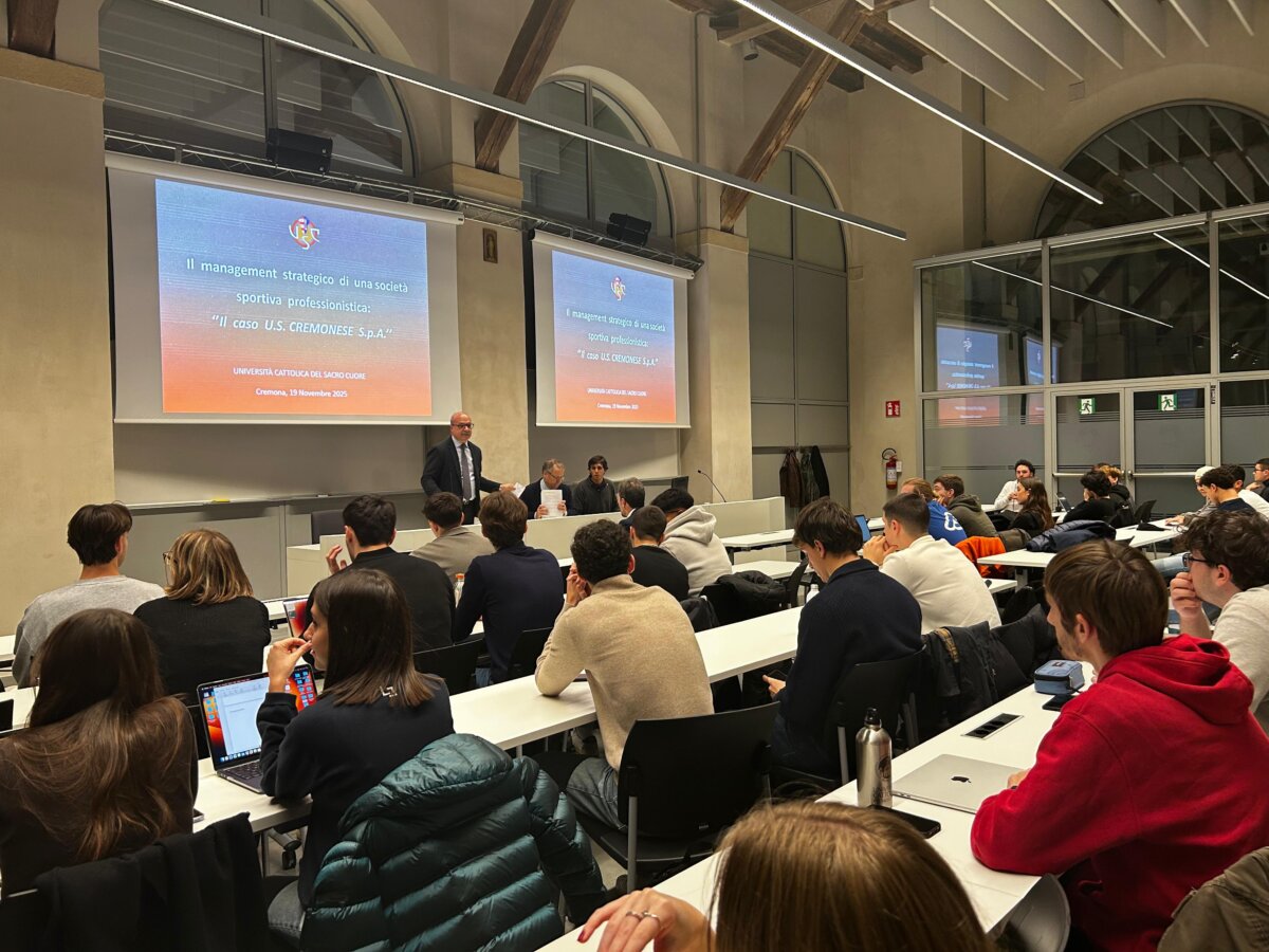 La Cremonese è una delle sorprese più affascinanti della Serie A 2025/2026. Per studiare i segreti di questa storia di successo, imparando direttamente dai suoi protagonisti, nel campus di Santa Monica dell’Università Cattolica del Sacro Cuore si è tenuto il seminario “Il management strategico di una società sportiva professionistica: il caso U.S. Cremonese Spa”. L’’idea è del Professor Fabio Antoldi, docente di Strategia aziendale e Direttore del Centro di ricerca per lo sviluppo imprenditoriale (Cersi), che ha organizzato una lezione davvero speciale per gli studenti della laurea triennale in Economia aziendale e di quella magistrale in Management e innovazione digitale.