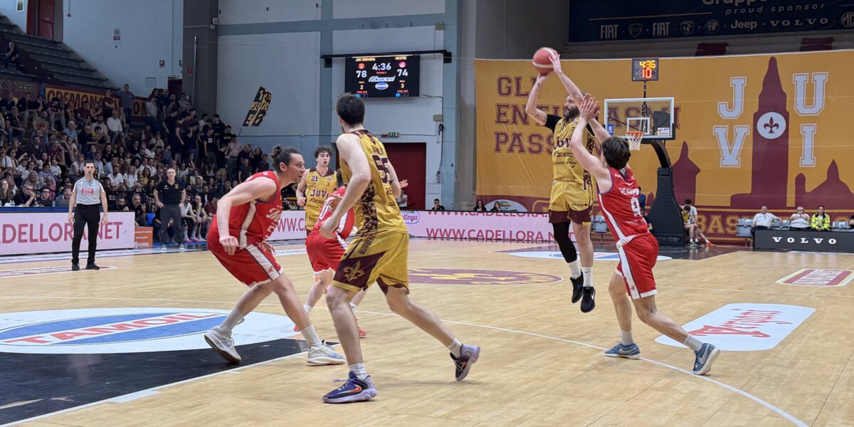Con le unghie e con i denti, senza Garrett ma con un Bartoli in più: la Juvi strappa i due punti al PalaRadi contro Mestre e, grazie alle contemporanee sconfitte di Torino e Urania, chiude all’11° posto, guadagnandosi il vantaggio del fattore campo nel primo turno dei play-in, che saranno proprio contro la Reale Mutua. Contro la Gemini finisce 83-82 per i gigliati, al termine di una gara che ha cambiato diverse volte padrone, ma incanalata nella giusta direzione dagli oroamaranto nei secondi finali grazie ad un Bartoli glaciale.