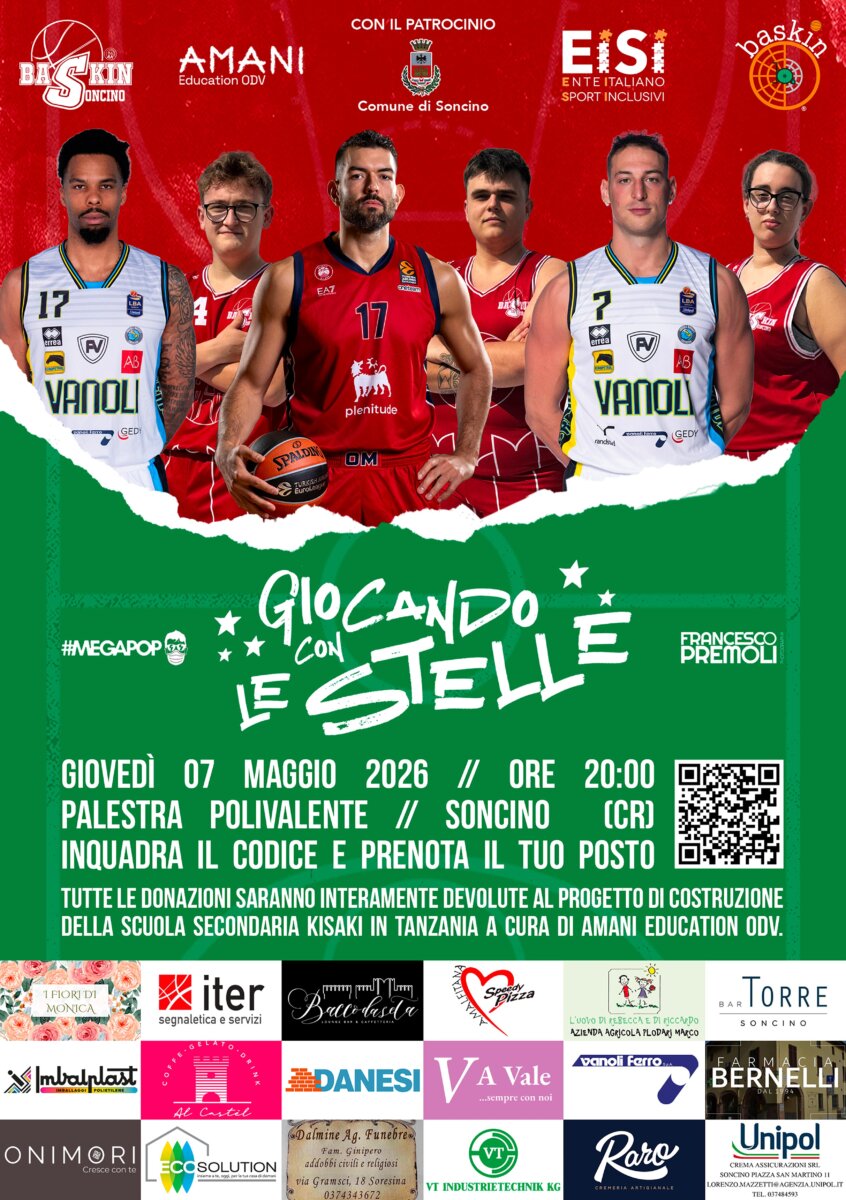 L’iniziativa, organizzata da Baskin Soncino in collaborazione con Amani Education ODV, ha un obiettivo importante: raccogliere fondi per la costruzione della scuola secondaria Kisaki, in Tanzania. Si tratta di un progetto concreto e significativo, sostenuto attivamente dal 2022 anche grazie all’impegno dell’associazione fondata proprio da Ricci.